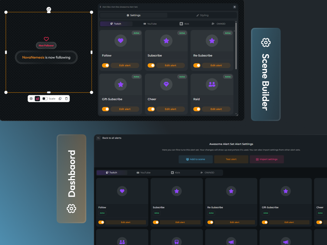 Edit this stream alert directly on OWN3D Pro and in the Scene Builder. Changing text, sounds, or animations takes just a few clicks. It’s never been easier to create an alert that perfectly matches your stream. Once finished, you can easily add it as a browser source in any broadcasting tool.